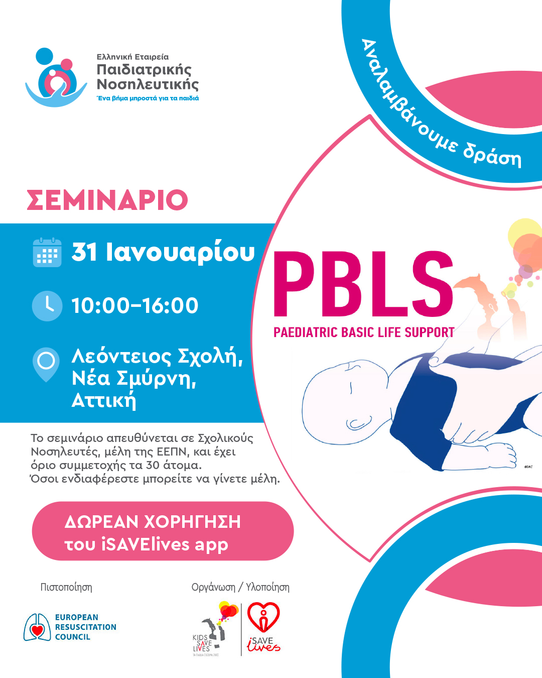 Αν φροντίζεις ένα βρέφος ή ένα παιδί, τότε η συμμετοχή σου σε αυτό το σεμινάριο είναι απαραίτητη. Μέσα από ένα ευχάριστο και έγκυρο περιεχόμενο θα μάθεις να αναγνωρίζεις γρήγορα και να διαχειρίζεσαι με ψυχραιμία μια δύσκολη κατάσταση ώστε να σώσεις τη ζωή ενός παιδιού. Το σεμινάριο απευθύνεται σε σχολικούς νοσηλευτές, μέλη της ΕΕΠΝ, και έχει όριο συμμετοχής τα 30 άτομα. Όσοι ενδιαφέρεστε μπορείτε να γίνετε μέλη.